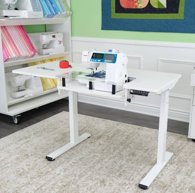 Hello dream sewing table! Electric height control with four memory settings for the perfect sewing height. Ultra comfortable sit or stand options for serging, sewing, and cutting projects. Compatible with custom acrylic sewing inserts to create a flush sewing surface. Lift opening accommodates standard sewing machines and sergers on the market, up to 40lbs. Large worksurface provides expansive sewing and crafting workspace. Extendable left side leaf to expand worksurface by an additional 9". Sewing lift raises to create a complete flush work surface for cutting projects or traditional desk usage. Sturdy design with steel legs for stability and easy mobility. Optional locking casters are available. Height adjustable from 28.7" - 48.4". Removable side extension leaf. Sit-or-Stand options for sewing, serving, and cutting projects. The platform accommodates most machines on the market, up to 40 lbs. Sturdy design with steel legs for stability and easy mobility. 5-year warranty, worry-free performance on frame and motor, and 2-year warranty on the controller, switch, and electronic components.