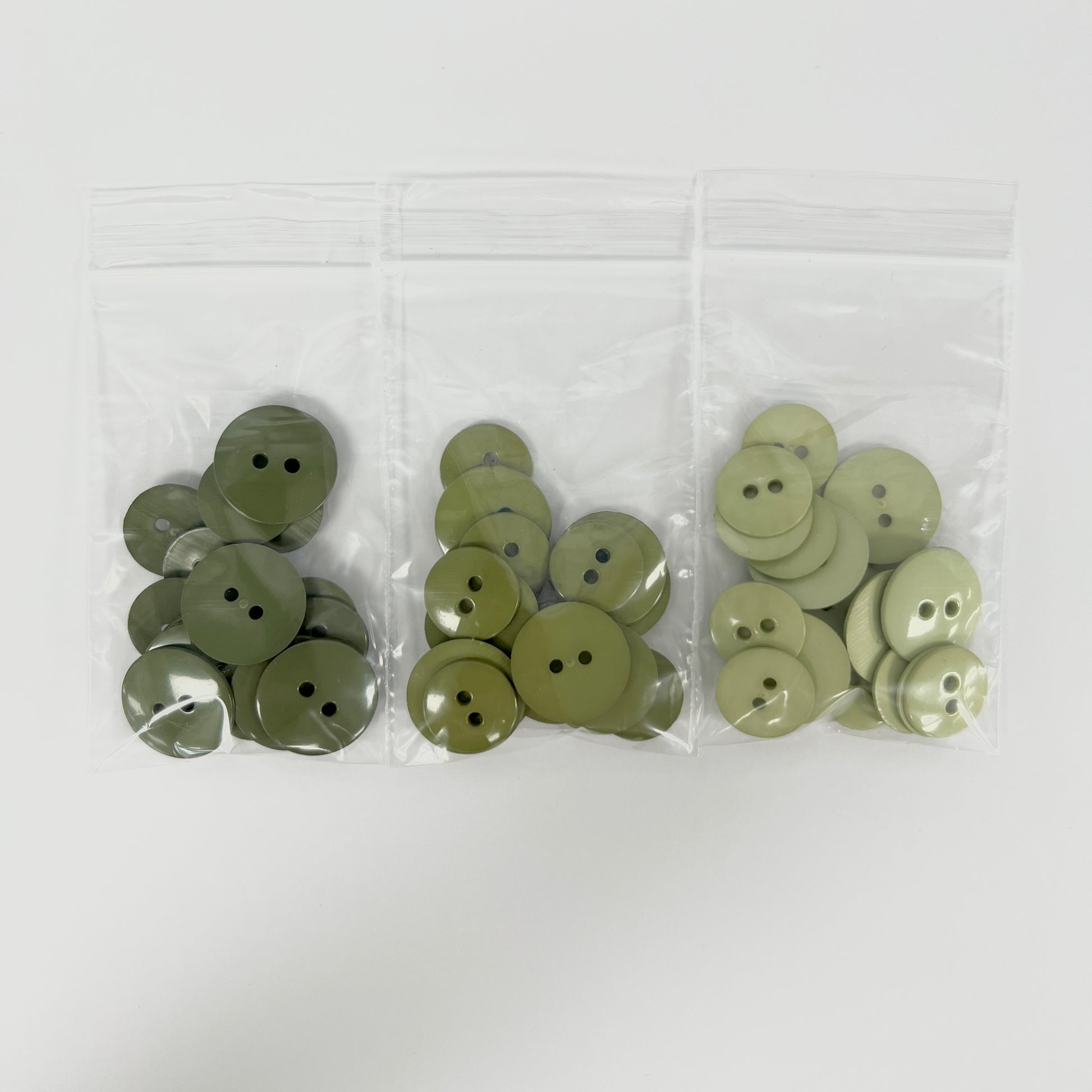 Each bag contains 11 buttons sized 5/8" (16mm) and 7 buttons sized 3/4" (19mm). Available in fun shades of light, medium, and dark green to brighten your sewing projects.